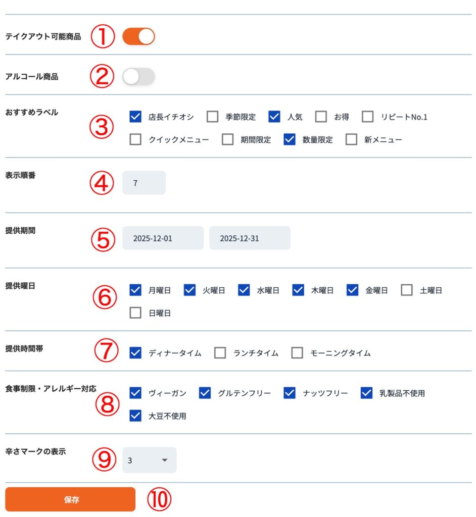 1詳細設定:テイクアウト可能商品の設定