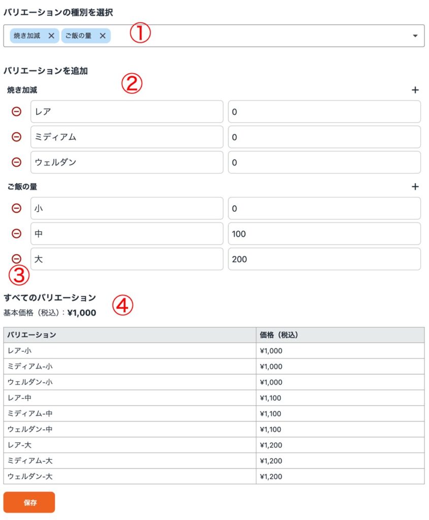 「バリエーションの種別を選択」で、サイズやトッピングなど、事前に登録されたバリエーション属性を複数選択できます。
