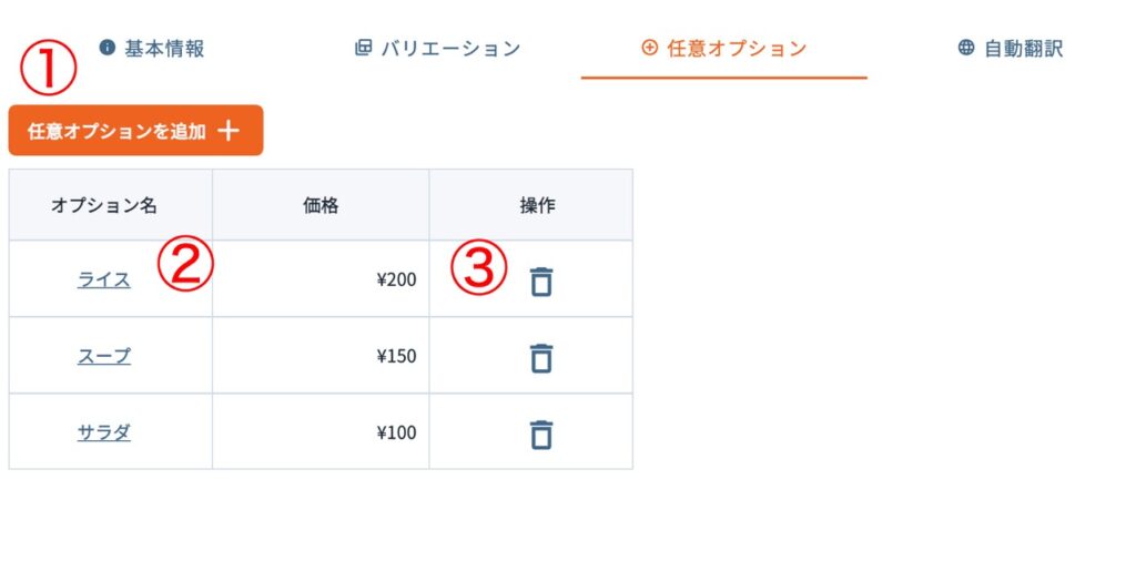 一覧の「オプション名」をクリックすると、登録時と同じダイアログが開き、名前や価格を編集できます。