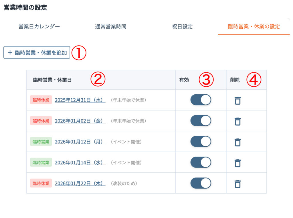 使用しなくなった臨時営業日や臨時休業日は削除することができますが、後から分析したり確認したりできるように、できるだけ残して運用することをお勧めします。1ヶ月以上古いものは自動で非表示になります。