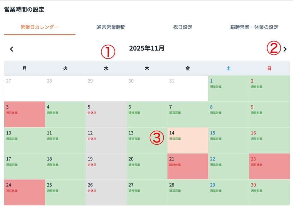 「営業日カレンダー」タブでは、月ごとの営業状況(通常営業・定休日・臨時休業・臨時営業・カスタム営業・祝日営業)を色分けされたカレンダーで確認できます。
