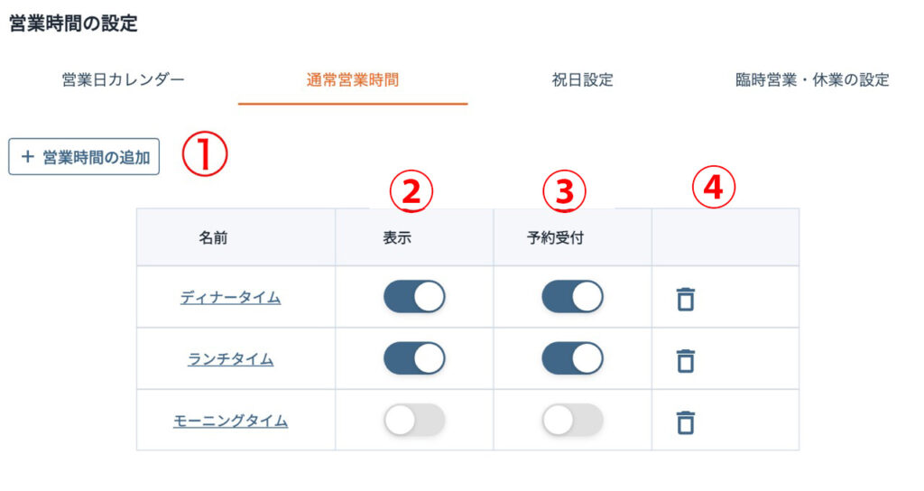 使わなくなった時間帯は削除できますが、既存の予約との整合性を考え、基本となるパターンはむやみに削除せず非表示で運用することをおすすめします。