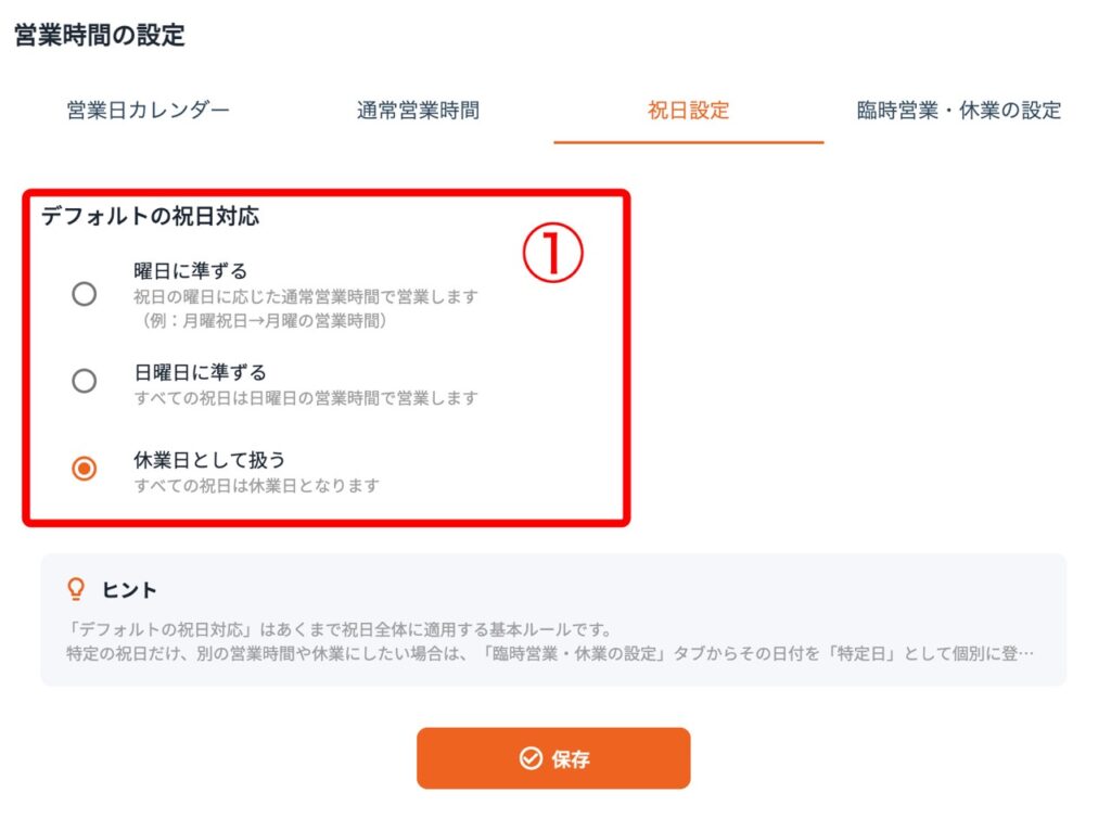 例として、「曜日に準ずる」を選ぶと、月曜祝日は「月曜日の通常営業時間」がそのまま適用されます。