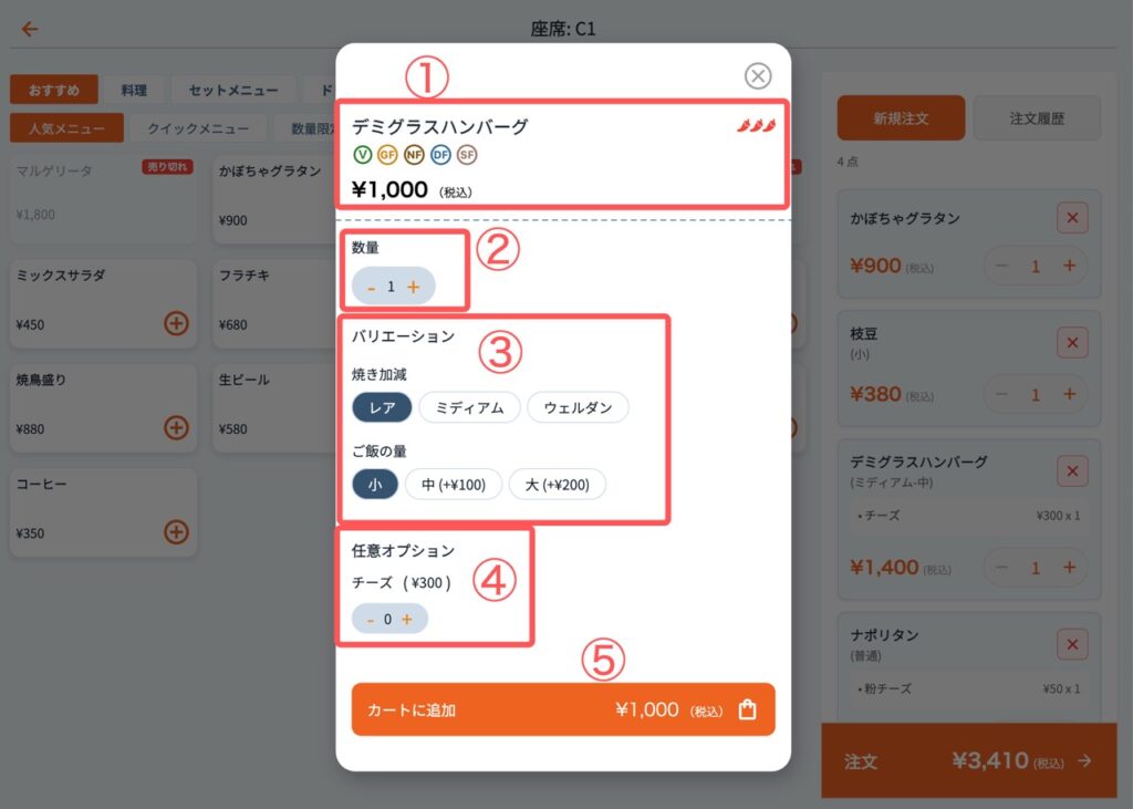 バリエーションやオプションのあるメニューをタップすると、「商品詳細ダイアログ」がポップアップで表示されます。