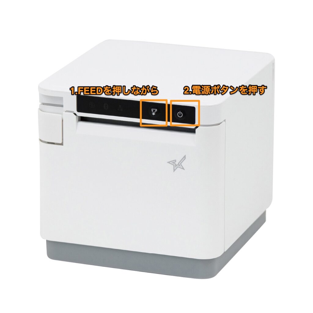 電源をオフにした状態で、プリンタ前面の「FEED(用紙送り)」ボタンを押しながら電源をオンにし、自己診断レポートを印刷します。