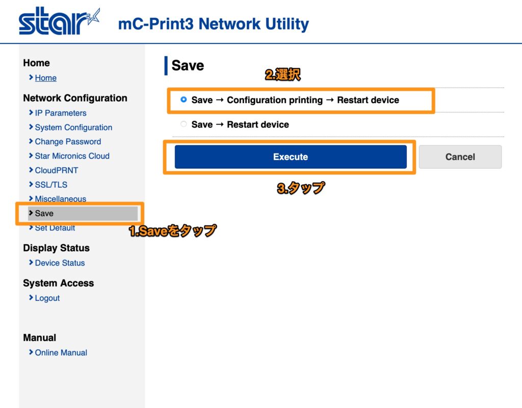 左メニューから『Save』をタップして、『Save → Configuration printing → Restart device』をタップします。