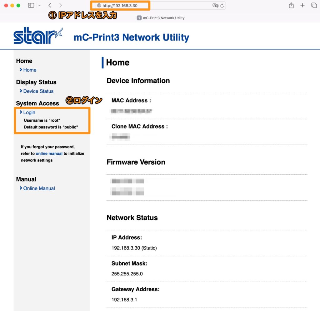 mC-Print3の設定画面(mC-Print3 Network Utility)が表示されたら、サイドバーの「Login」をクリックします。