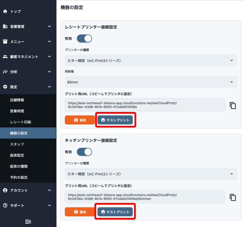 「テストプリント」ボタンを押して、レシートやキッチン伝票が正常に印刷されることを確認してください。