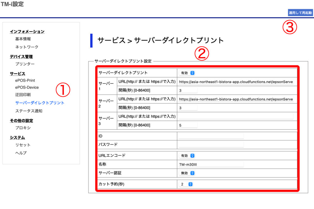 3.「適用して再起動」をクリックして設定を保存。プリンタが再起動します。