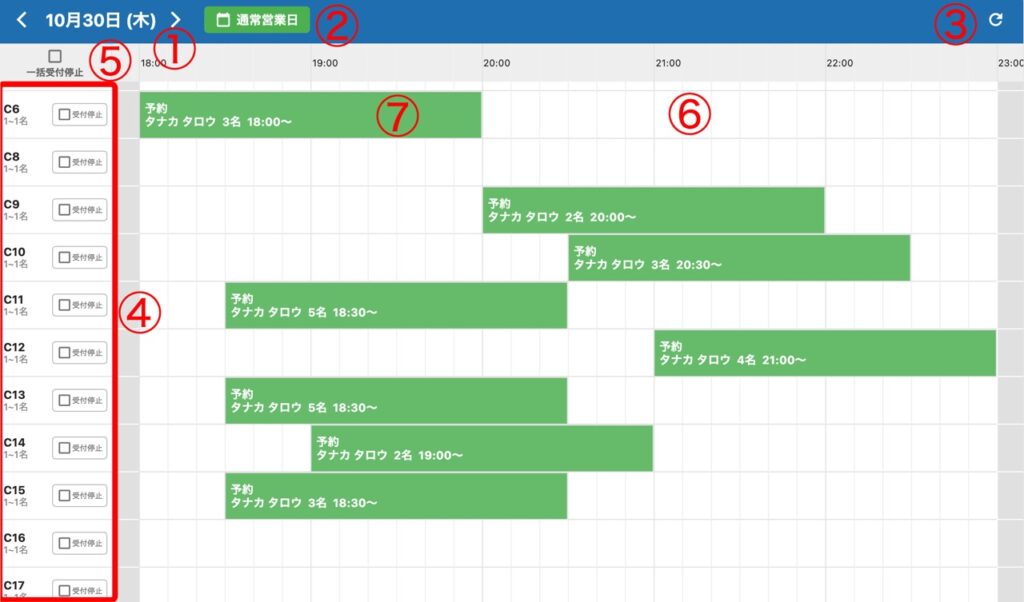 予約が入っていない白いマス(かつ営業時間内・受付可能な席の時間帯)をクリックすると、新規予約を追加できます。