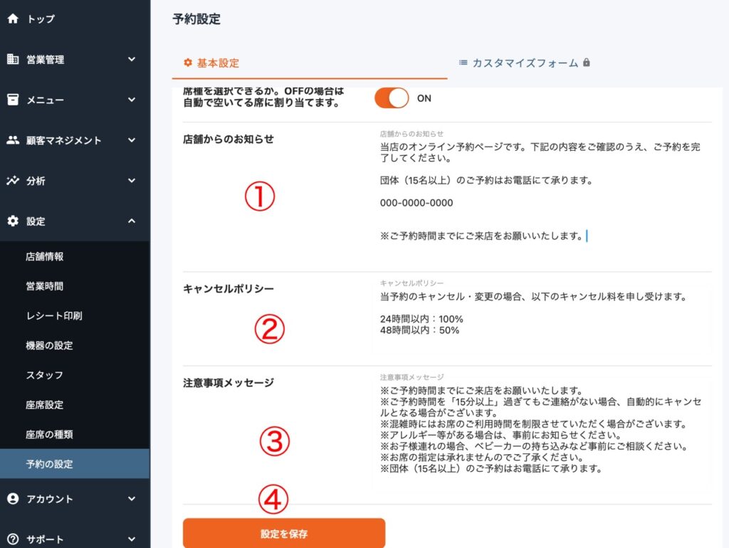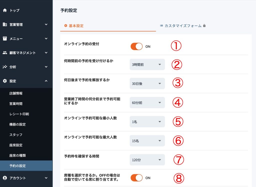 席種の希望が重要な店舗(テラス希望など)ではONにし、一方で小規模店舗や席数管理を簡略化したい場合はOFFにして自動割り当てにすると、スタッフの負担を減らせます。