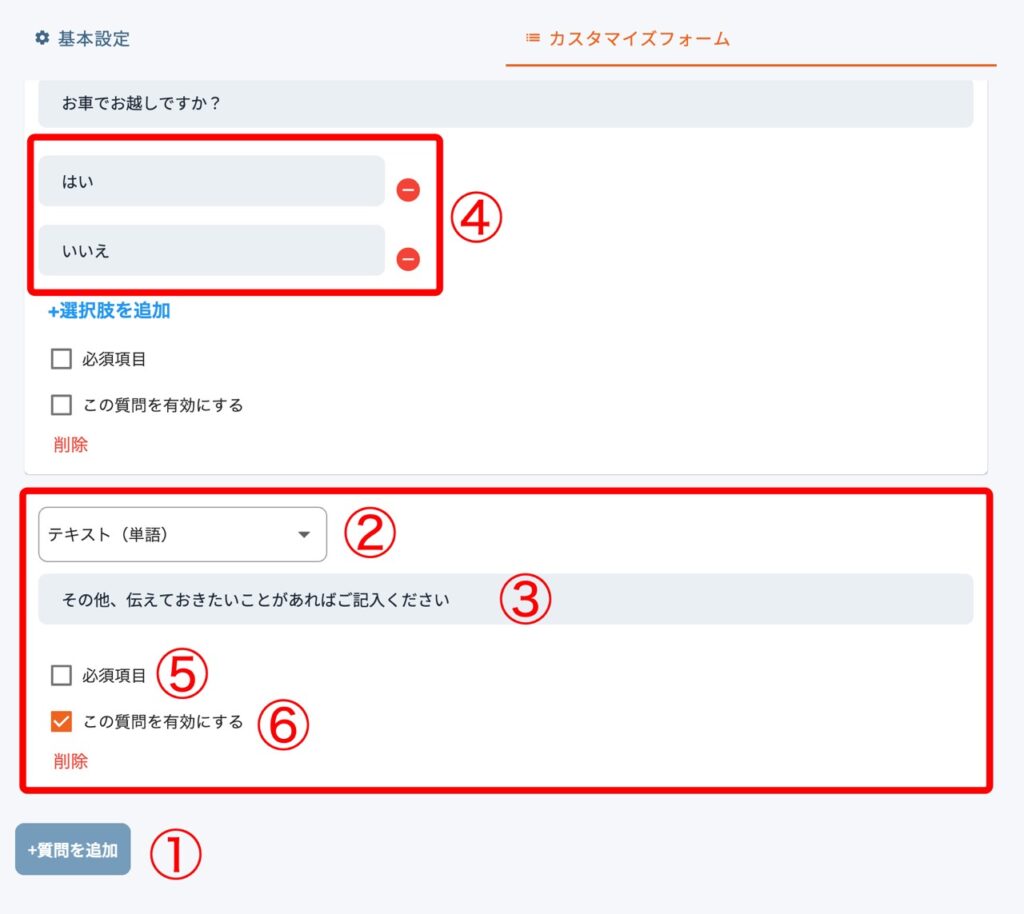 「カスタマイズフォーム」タブでは、オンライン予約時にお客様に表示される追加質問(アンケート項目や要望欄など)を自由に設計できます。