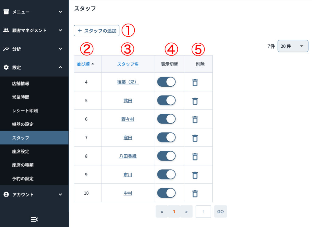 一時的に利用しないスタッフは、削除ではなく「表示」をOFFにしておくことで、再雇用時などに設定を復元しやすくなります。