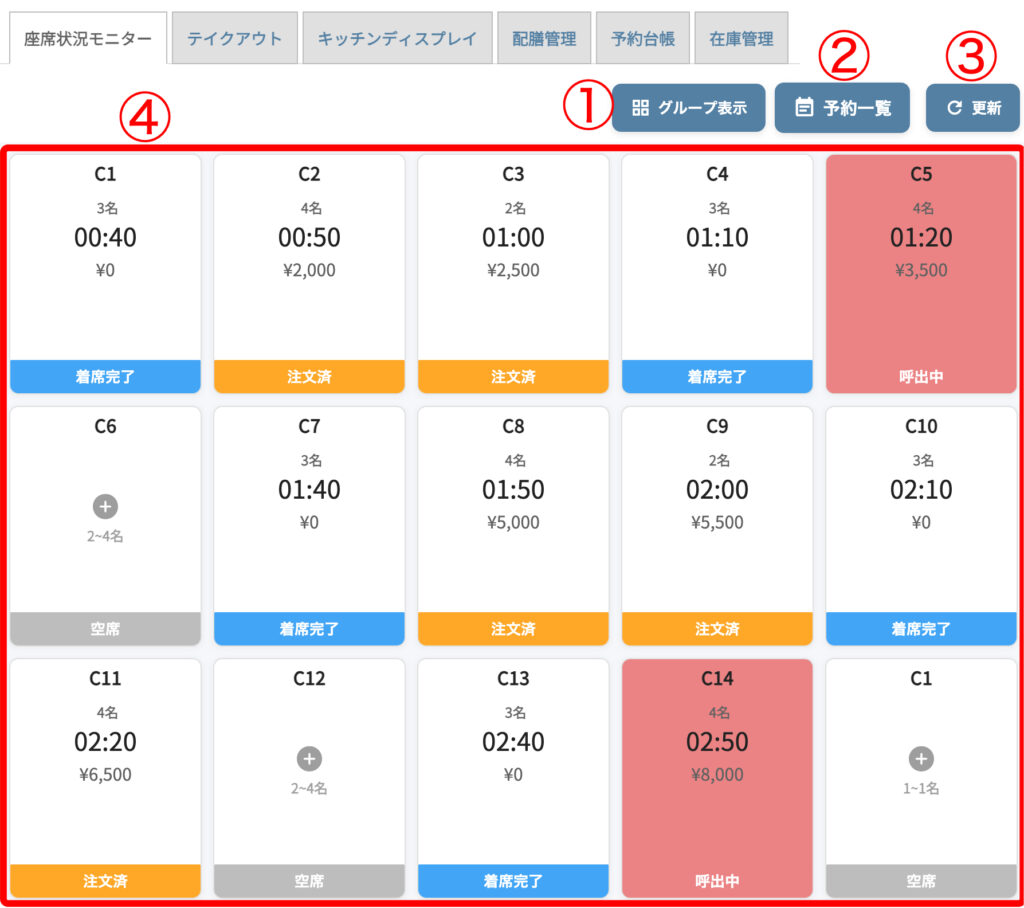 「空席/着席完了/注文済/会計中/結合中/呼出中」などの状態を色とラベルで可視化し、入店処理・滞在時間の把握・当日予約の確認に利用します。