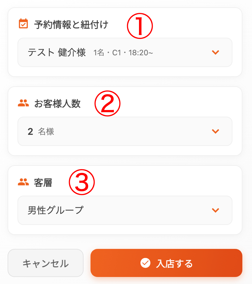 ここでは、予約情報との紐付け・人数・客層を確認してから「入店する」ボタンでテーブルを「着席」状態に変更します。