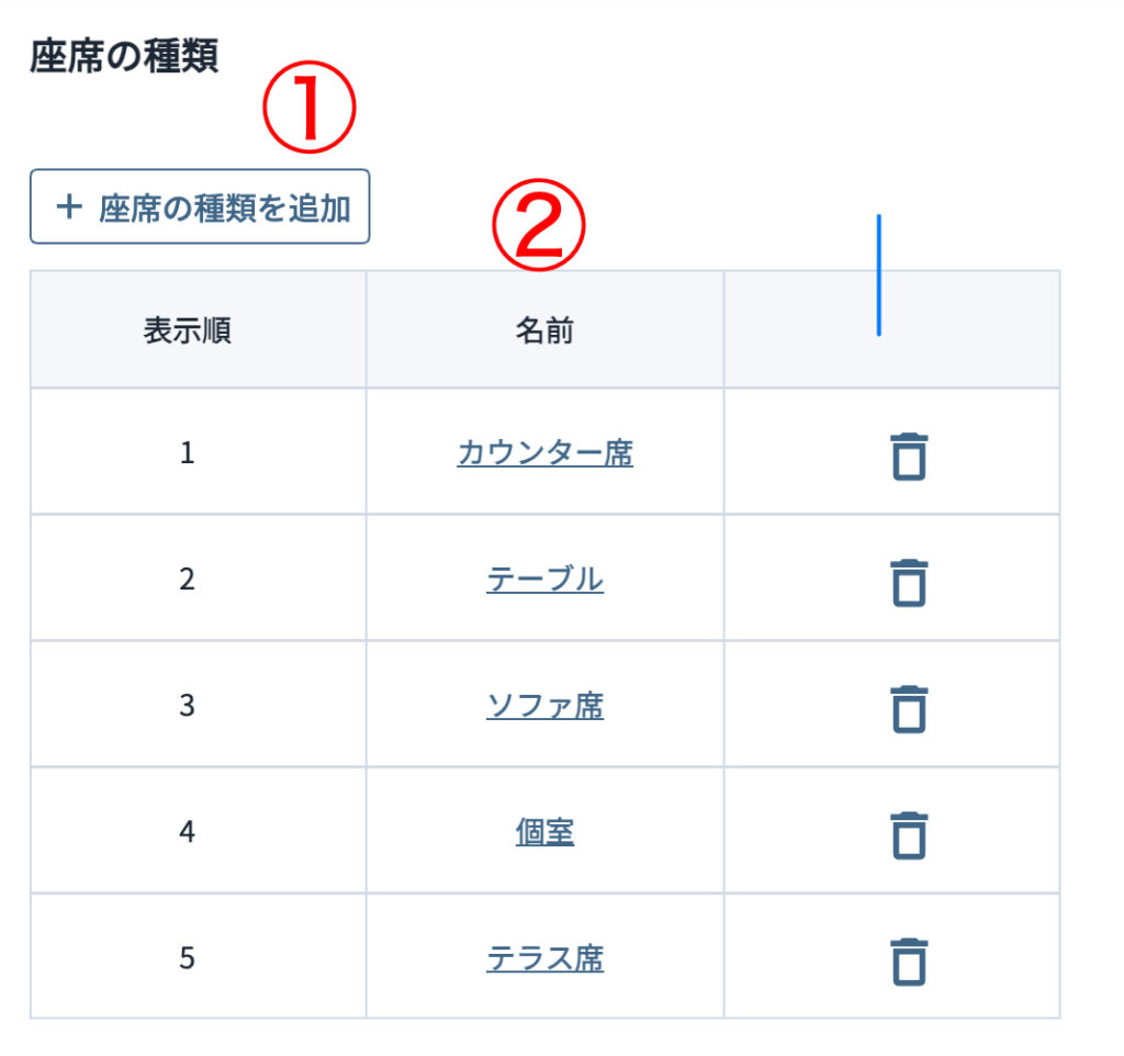 ・「名前」:座席種類の名称です(例:テーブル席、カウンター席、テラス席 など)。クリックすると編集ダイアログが開きます。