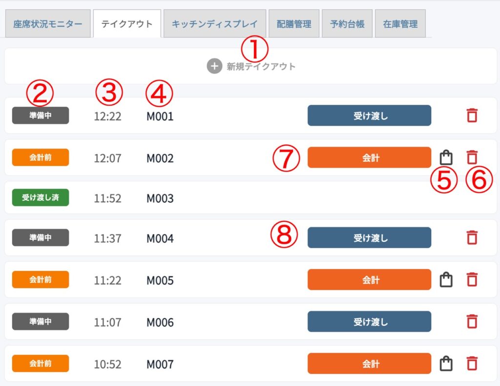 この画面では、当日のテイクアウト注文の受付状況を一覧で確認・操作できます。