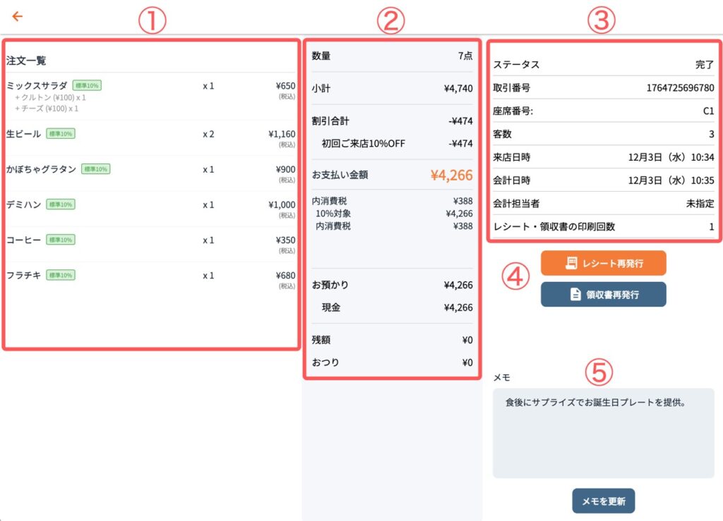 注文したメニュー、税務区分、数量、税込金額が一覧で確認できます。