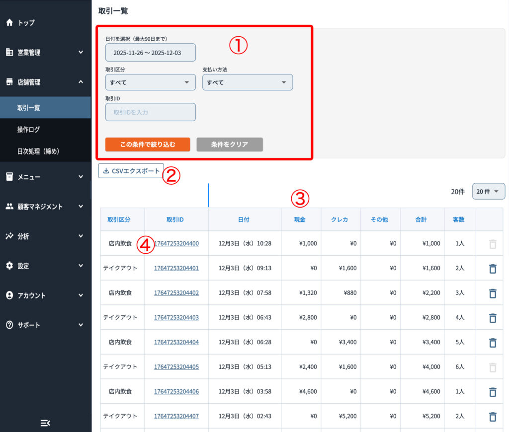 ・「取引区分」:店内/テイクアウトなどの取引種別で絞り込みます。
